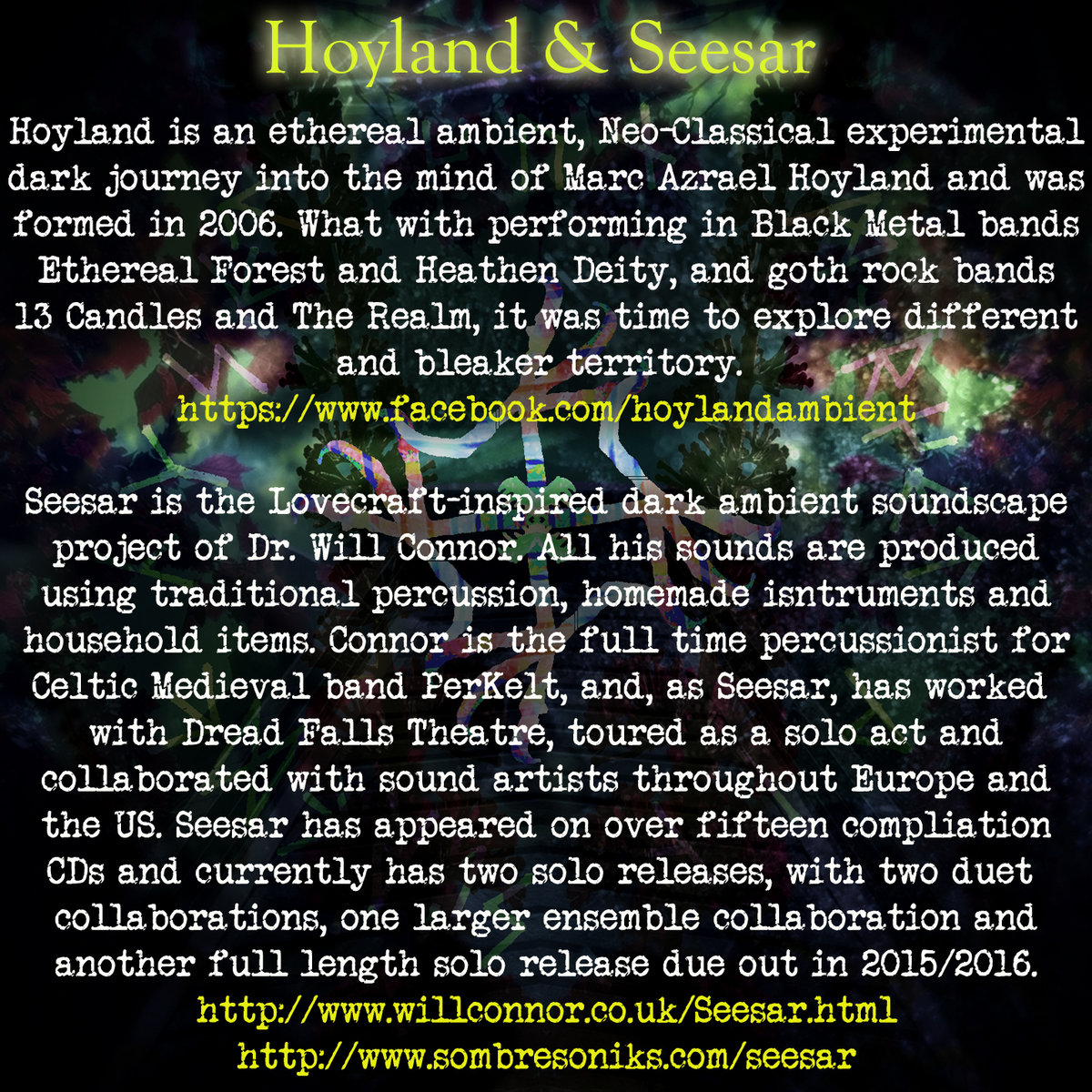 Sombre Soniks is a label mainly specializing in Dark Ambient artists and also Projekts of a Ritual or Ethnomuzikologikal nature.